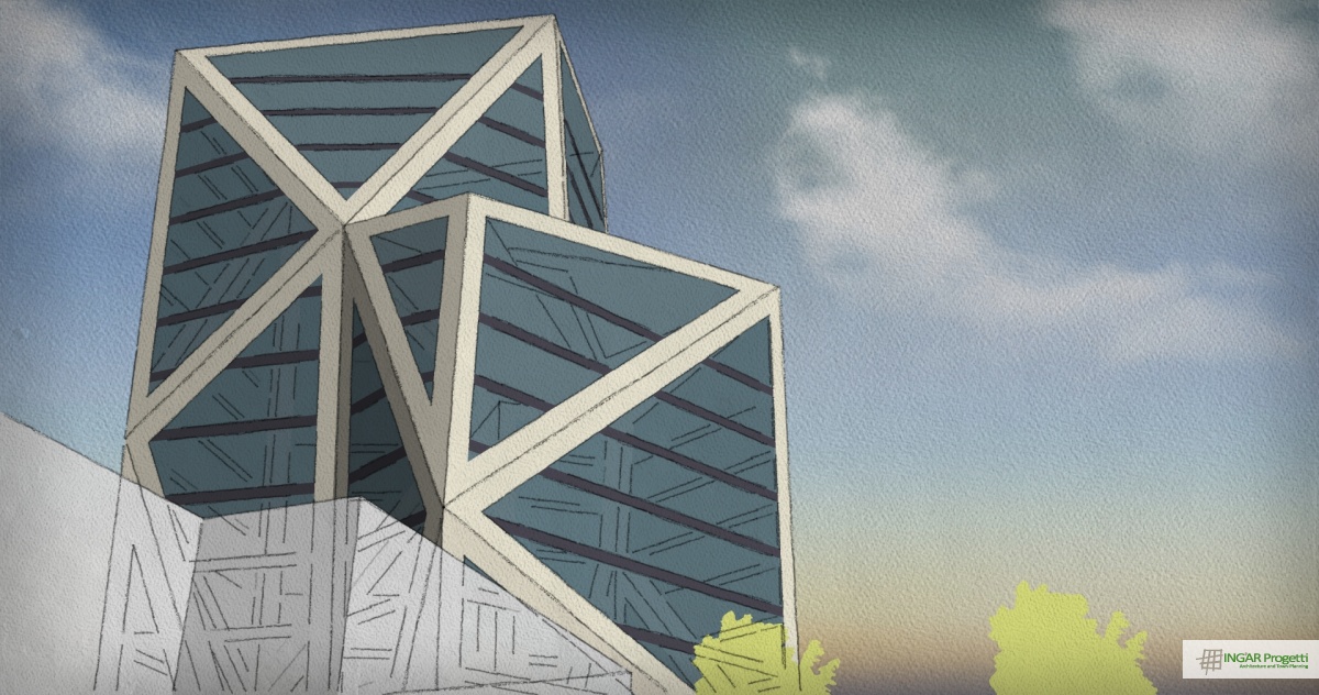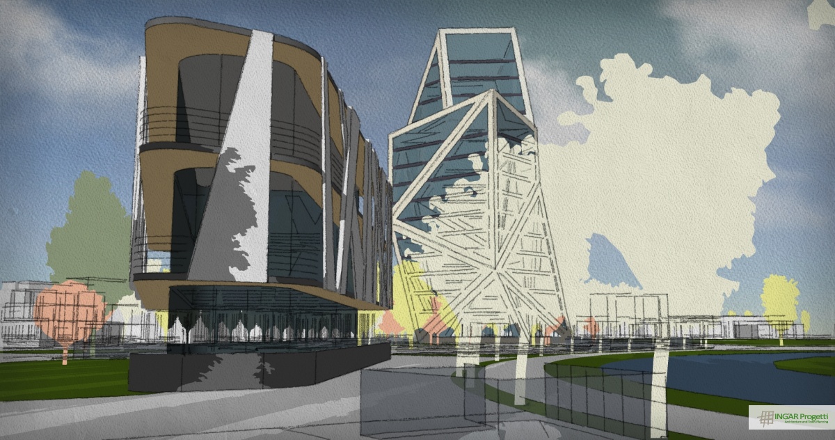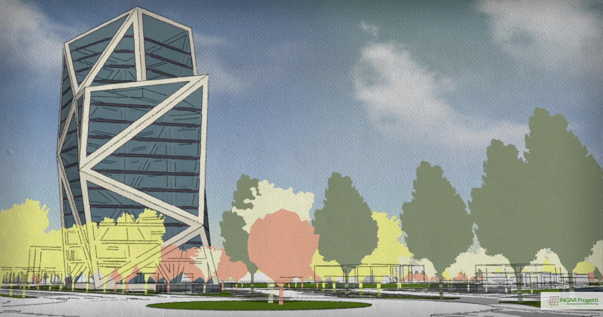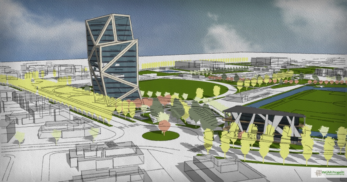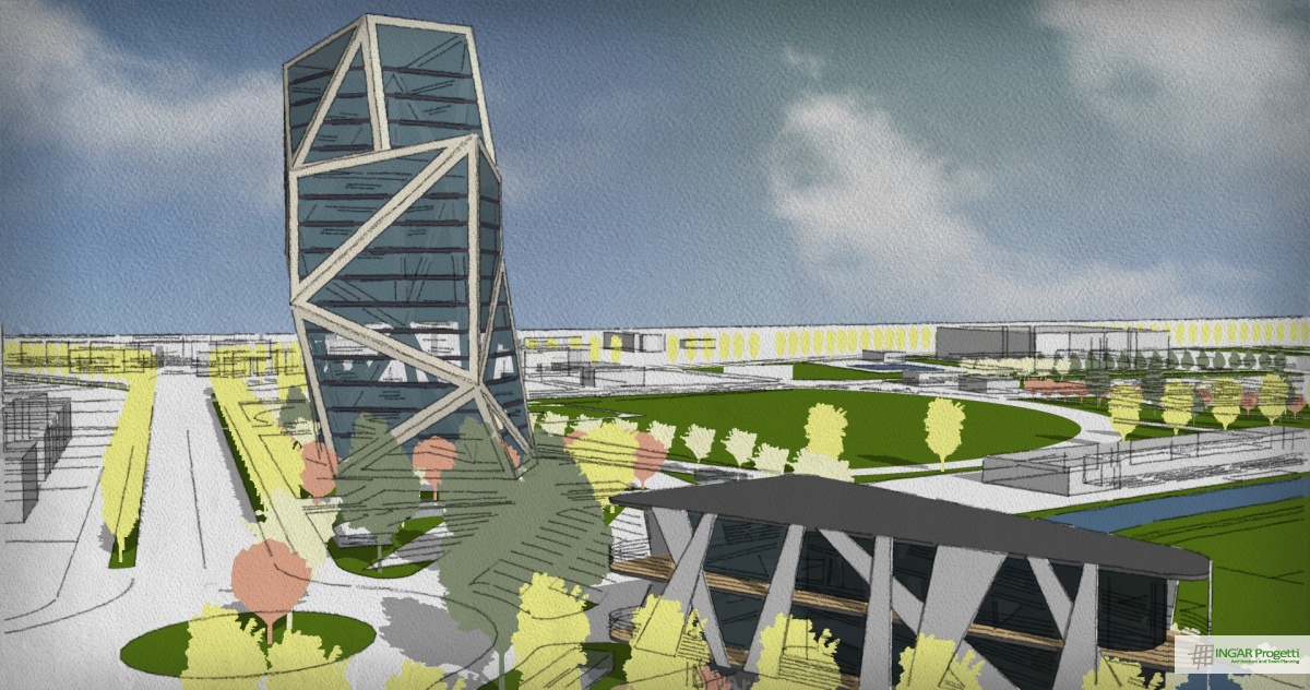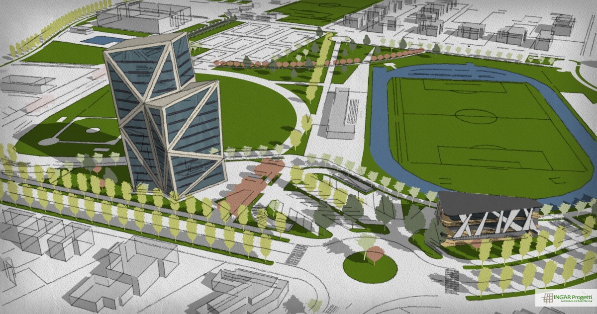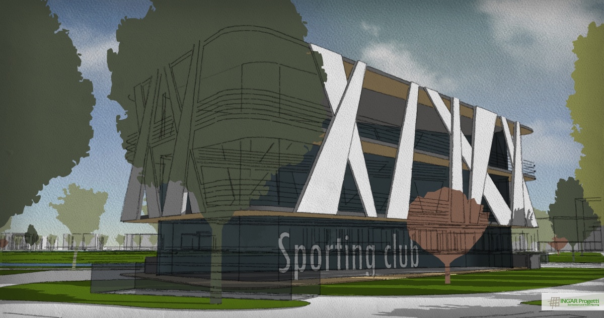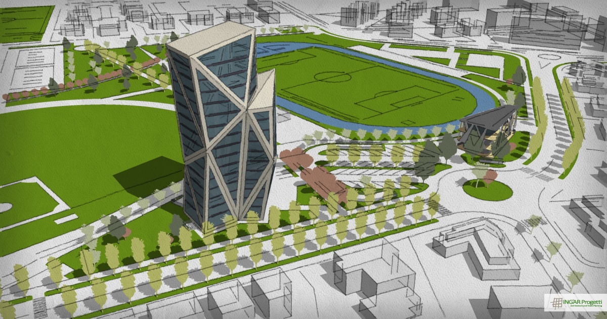 Progetto di ammodernamento e riqualificazione di area sportiva mediante la nuova costruzione di un edificio a torre residenziale e terziario, di un edificio a due piani da adibire a Sporting Club e la riorganizzazione della viabilità e dei parcheggi. Il progetto è caratterizzato da un design moderno e dinamico, che ben si sposa con la vocazione sportiva dell’area.